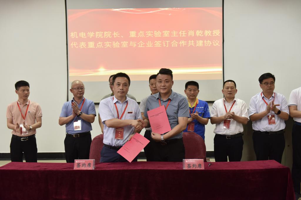 机电学院院长、重点实验室主任肖乾教授代表重点实验室,分别与江西江铃集团新能源汽车有限公司、株洲国创轨道科技有限公司、山东汉格威新能源汽车电控制造有限公司、江西华伍制动器股份有限公司、江西省投资集团有限公司、江西南行投资控股有限公司、江西纵横特种设备有限公司、扬州市华胜机电制造有限公司、深圳市蔚蓝智能视觉技术有限公司9家企业签订合作共建协议。